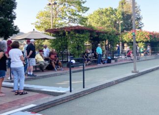 As sunset neared on a recent weeknight, competitors played on each of the Marin Bocce...