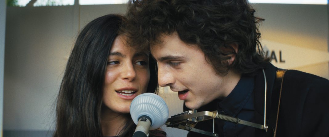 The moment 20-year-old Dylan (Timothée Chalamet) first steps onto MacDougal Street, he wears an innocent expression on his face. That doesn’t last very long. As he makes the rounds of Village folk clubs and interacts with the bohos, Beats, guitar pickers and various ambitious entertainers, our hero acquires wised-up eyes.